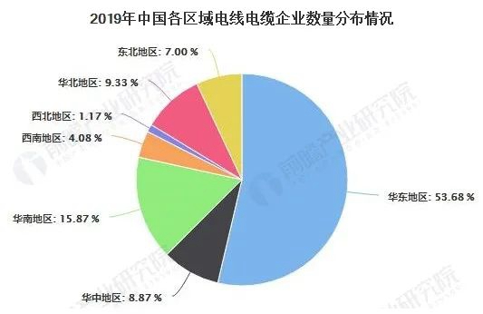從圖中可以看出,我國(guó)全國(guó)各區(qū)域電線(xiàn)電纜企業(yè)分布不均,從各個(gè)地區(qū)的企業(yè)數(shù)量來(lái)看,2019年,華東地區(qū)電線(xiàn)電纜行業(yè)企業(yè)數(shù)量多,占全行業(yè)企業(yè)總數(shù)的一半以上,達(dá)到53.68%,具有較強(qiáng)的競(jìng)爭(zhēng)優(yōu)勢(shì);其次是華南地區(qū),企業(yè)數(shù)量占行業(yè)內(nèi)企業(yè)總數(shù)的15.87%,其他地區(qū)企業(yè)數(shù)量占比均在10%以下。
